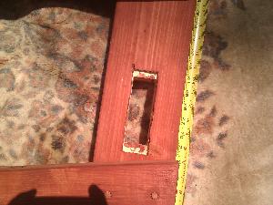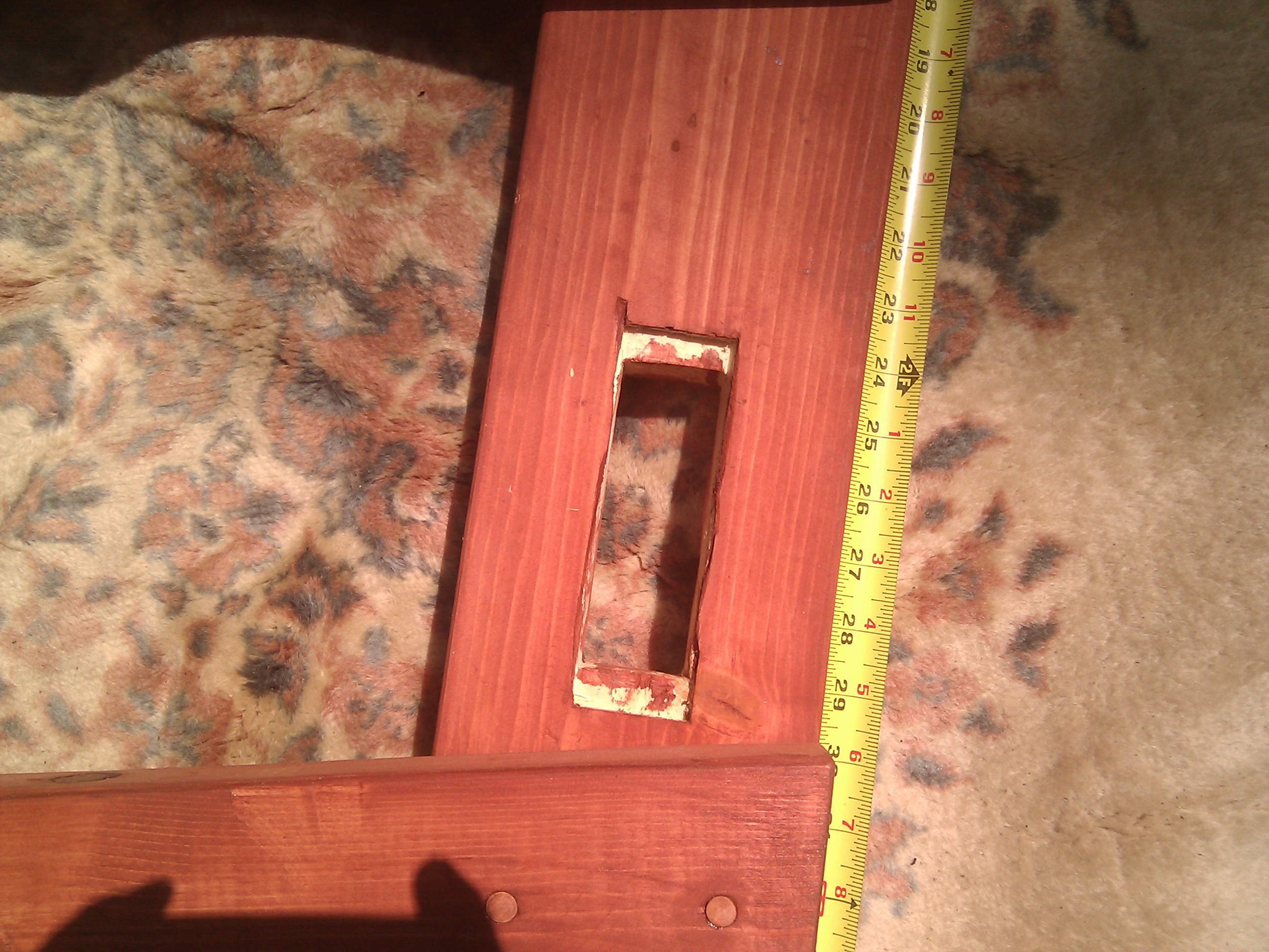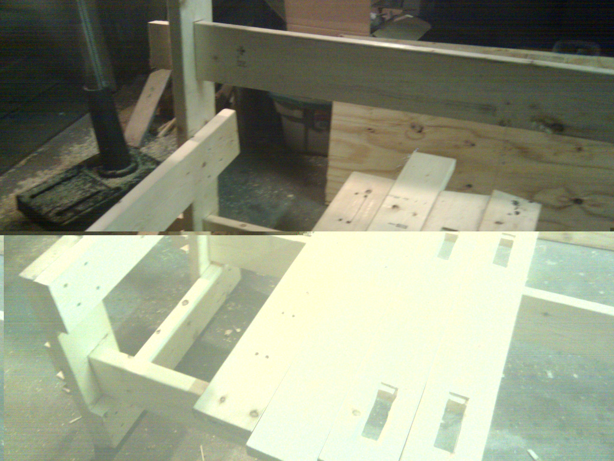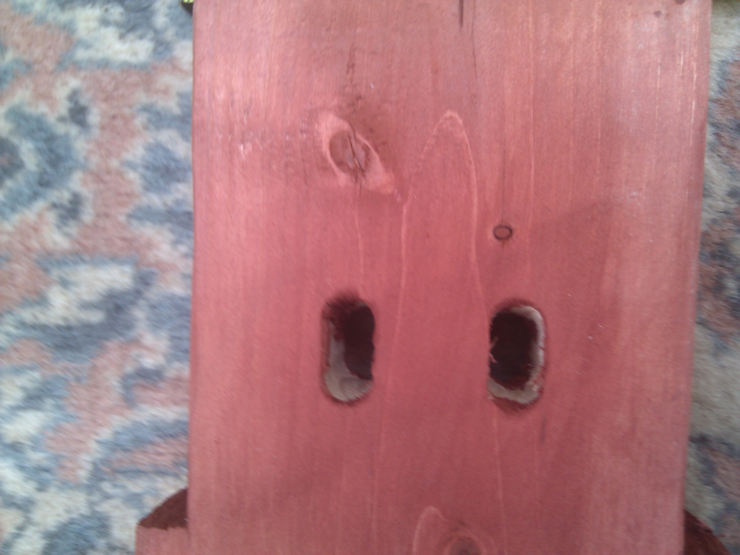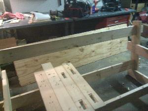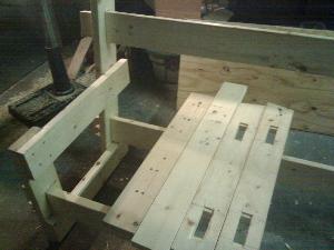 In any event, my next version will almost certainly not bother with trying to have the last 2" of the armrest provide support. The grain doesn't really support it, all of the armrests cracked when I screwed them down (after the first one, I preemptively reinforced them with screws, and added a second piece of wood with the grain perpendicular to the armrest to take the actual load). In the future, I'll just cut the corner out, and make the second piece of wood longer, to support the whole thing.