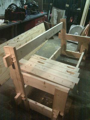 These couches use through-mortises with tusk-pegged tenons to make for a sturdy, stable piece of furniture that can be assembled easily (and more to the point, disassembled easily at the end of two weeks).