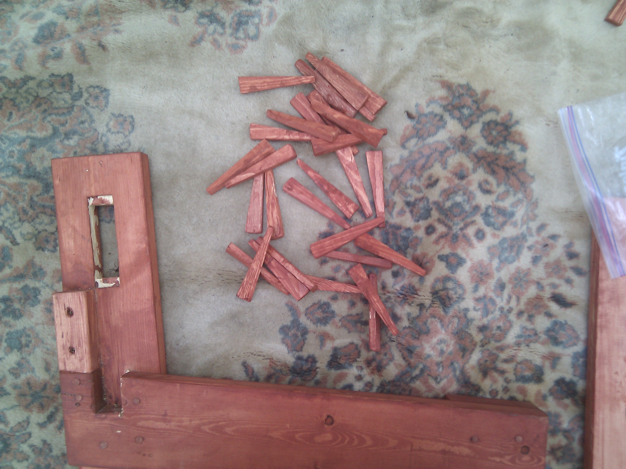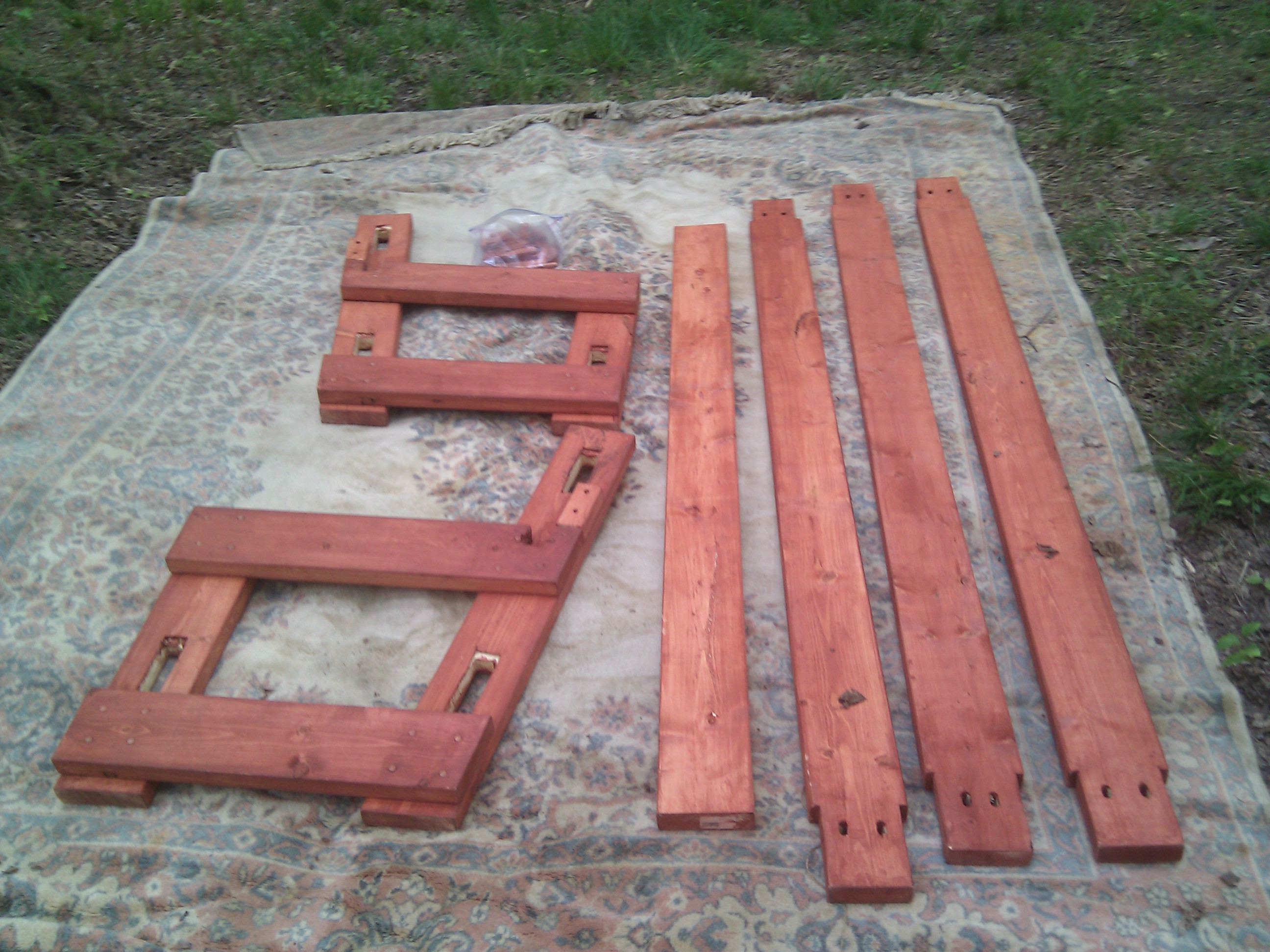 Here we are in the woods, getting ready to assemble the couches. I made two, but only photographed one. Here's the full set of parts at the start.