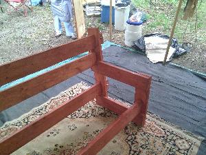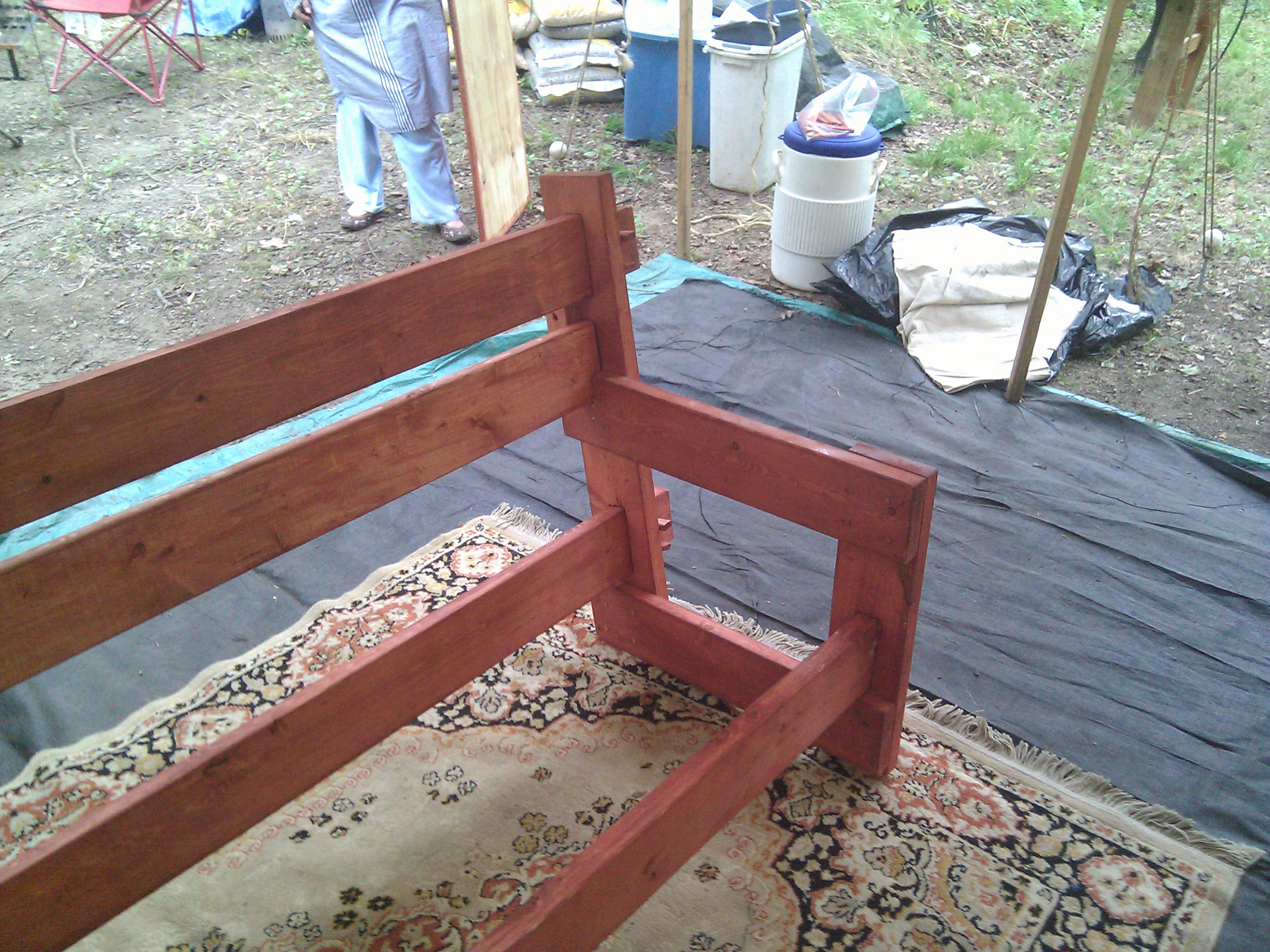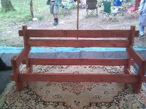 For next year, I plan to replace the hunk of plywood with slats, which will both make it not look so horribly modern without the cushions and coverings (usually we pack rain-sensitive stuff down ahead of time at the end, to avoid having to take it home wet and spread it out to dry) and make the seat have a bit more flex for comfort. I also plan to change some of the proportions (see below).